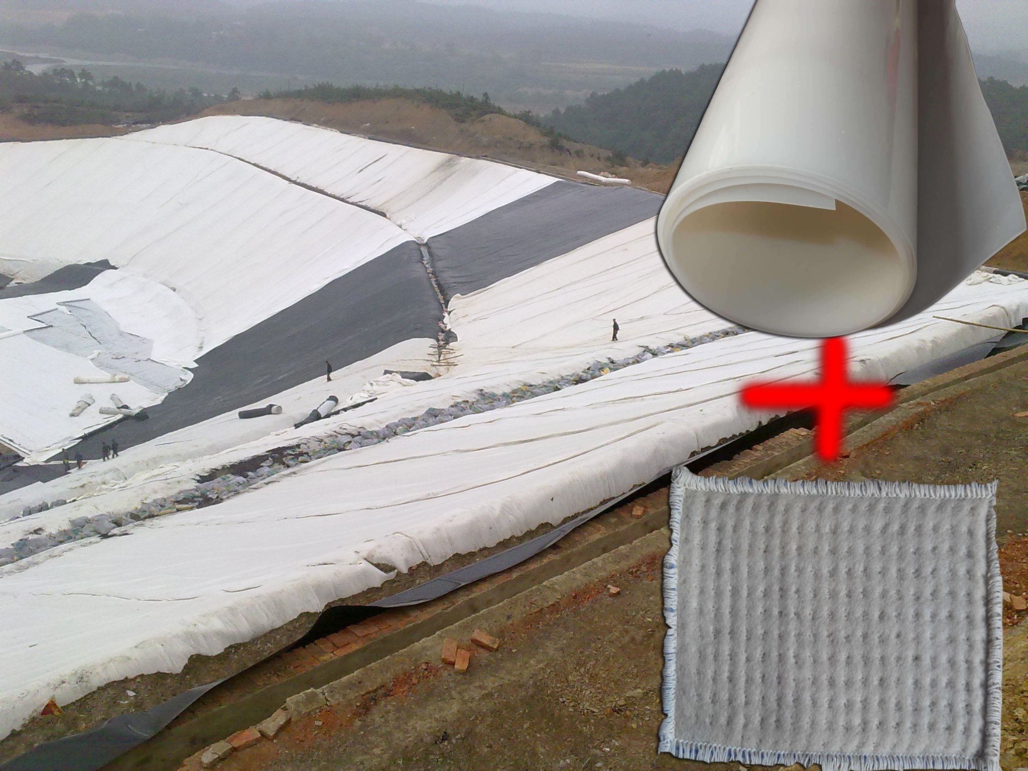 一膜一墊的鋪裝構造組成場底防滲結構,可實現多種情況的防滲要求,經濟而有效。這種是選用德旭達土工材料有限公司生產的1.5mm厚HDPE土工膜,土工膜上再鋪上一層4800g/㎡的膨潤土防水墊。