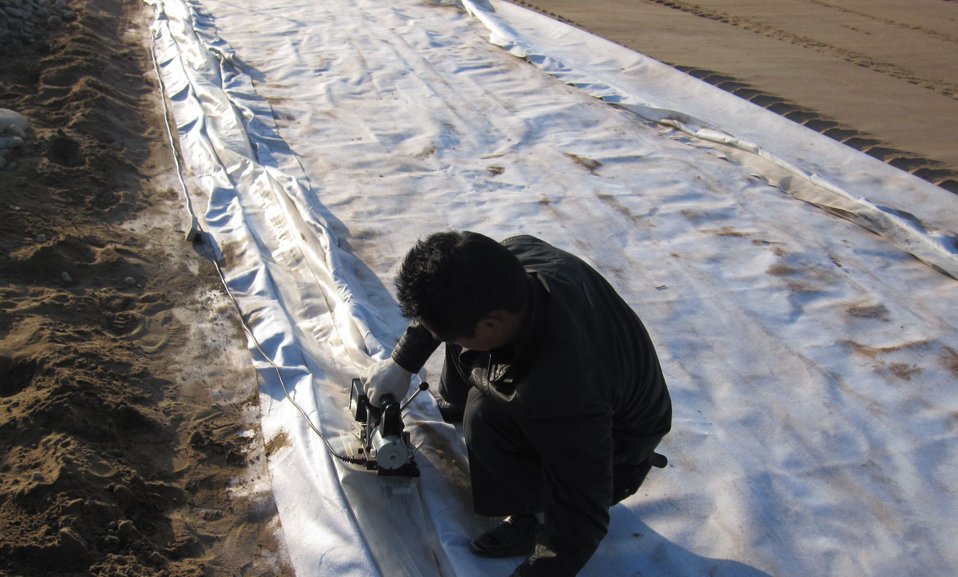 在復合土工膜鋪設前,要求坡面修整完畢,坡面平整度、壓實度均達到設計要求并經監理工程師驗收合格后方可進行復合土工膜的鋪設.鋪設前應根據復合土工膜拼接后幅寬、現場長度需要,在單位內剪裁,并拼接成符合要求尺寸的塊體后鋪設.從堤頂向堤腳沿垂直于堤軸線方向緩慢展鋪到坡腳齒槽外頂處與庫底土工膜丁字形相接.鋪設選在干燥暖和天氣進行,為避免踩壞土工膜,施工人員均穿平底布鞋進行鋪設,為防止應力集中,復合土工膜鋪設的富余度約為1.5%,并要求攤開復合土工膜與坡面吻合平整,無突起褶皺.土工膜鋪設后應平順,局部可以起皺,但不許有破損、孔洞,膜之間及膜與砼之間接口的焊接或粘接要嚴密不透水.施工時如發現問題,應及時修補。